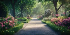 Sun-Dappled Path Winds Through a Vibrant Garden, Blooming with Colorful Flowers.