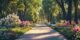 Sun-Dappled Path Winds Through a Vibrant Garden, Blooming with Colorful Flowers.