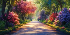 Sun-Dappled Path Winds Through a Vibrant Garden, Blooming with Colorful Flowers.