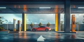 Modern Electric Vehicle Charging Station with Cars Plugged In.