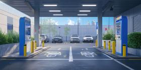 Modern Electric Vehicle Charging Station with Cars Plugged In.