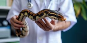 Veterinarian Holding Large Snake: Detailed Close-Up of Reptile with Patterned Skin in Professional Setting