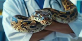 Veterinarian Holding Large Snake: Detailed Close-Up of Reptile with Patterned Skin in Professional Setting