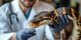 Veterinarian Holding Large Snake: Detailed Close-Up of Reptile with Patterned Skin in Professional Setting