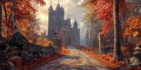 Autumnal Road Winds Through a Forested Landscape, Leading to a Majestic Castle.