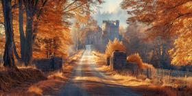 Autumnal Road Winds Through a Forested Landscape, Leading to a Majestic Castle.