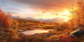 Golden Autumn Forest Trail Leads to Snow-Capped Peaks, Bathed in Warm Sunlight.