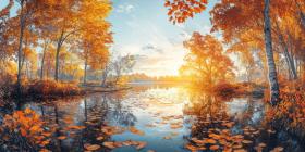 Golden Autumn Forest Trail Leads to Snow-Capped Peaks, Bathed in Warm Sunlight.