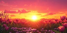 Vibrant Sunset Bathes a Field of Blossoming Tulips in Warm Golden Light.