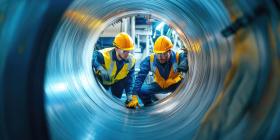 Industrial Inspection: Workers Wearing Safety Helmets and High-Visibility Vests Inside Large Metallic Cylinder