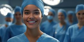 Healthcare Professional in Blue Scrubs with Stethoscope in a Busy Hospital Hallway
