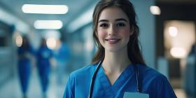 Healthcare Professional in Blue Scrubs with Stethoscope in a Busy Hospital Hallway
