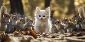 Curious Kitten Leads a Swarm of Squirrels on a Woodland Adventure