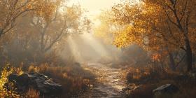 Golden Sunlight Bathes a Path Through a Dreamy Autumn Forest, Enchanting and Serene.