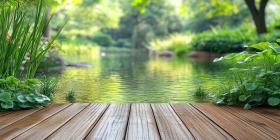 Tranquil Pondside View: Wooden Dock Overlooking a Serene Waterscape