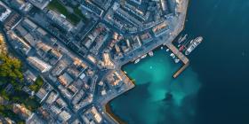 Aerial View of a Charming Coastal Town with Harbor and Colorful Buildings