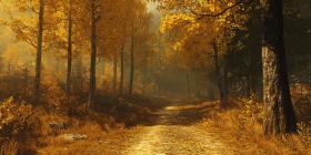 Golden Sunlight Bathes a Path Through a Dreamy Autumn Forest, Enchanting and Serene.