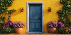 Vibrant Yellow House with a Navy Blue Door, Flanked by Colorful Flower Pots