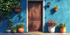Vibrant Yellow House with a Navy Blue Door, Flanked by Colorful Flower Pots
