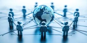 Global Connectivity: Network of Human Figures Connected by Lines Around a Digital Globe