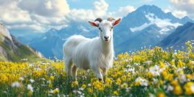 Alpine Serenity: A Goat Grazes Amidst a Meadow of Daisies
