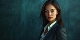 Confident Professional: Person with Light Hair and Glasses in Dark Blazer, Standing Against Abstract Blue-Green Background