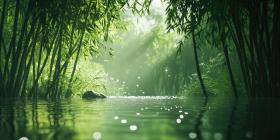 Sunlight Dappled Path Through a Lush and Serene Bamboo Forest