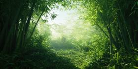 Sunlight Dappled Path Through a Lush and Serene Bamboo Forest