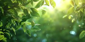 Sunlight Filtering Through Dew-Kissed Leaves in a Lush Green Forest