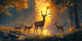 Majestic Deer Herd Grazes in a Sunlit Forest Clearing