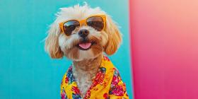 Cool Canine: A Stylish Dog in Sunglasses and a Sweater Strikes a Pose