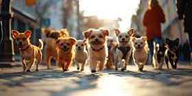 Pack of Pups on Patrol: A Group of Small Dogs Run Joyfully Down the Street