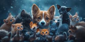 Cozy Cottage Critters: A Trio of Dogs and a Curious Guinea Pig Pose for a Portrait