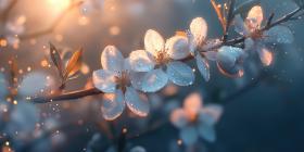 Dew-Kissed Bloom: A branch of delicate white blossoms, glistening with morning dew, welcomes the sunrise in a symphony of light and nature.