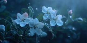 Dew-Kissed Bloom: A branch of delicate white blossoms, glistening with morning dew, welcomes the sunrise in a symphony of light and nature.