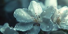 Dew-Kissed Bloom: A branch of delicate white blossoms, glistening with morning dew, welcomes the sunrise in a symphony of light and nature.