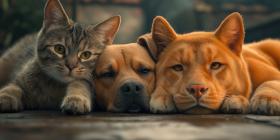 Cozy Cottage Critters: A Trio of Dogs and a Curious Guinea Pig Pose for a Portrait