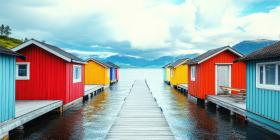 A Fjord of Colors: A row of brightly painted houses lines a tranquil fjord, nestled amidst towering mountains and a picturesque landscape.