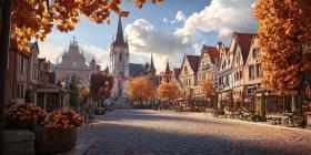 Autumn's Embrace: A charming European town square basks in the warm glow of autumn, leaves dancing in the breeze as the sun casts long shadows.