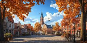 Autumn's Embrace: A charming European town square basks in the warm glow of autumn, leaves dancing in the breeze as the sun casts long shadows.