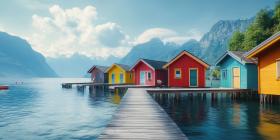 A Fjord of Colors: A row of brightly painted houses lines a tranquil fjord, nestled amidst towering mountains and a picturesque landscape.