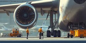 Pre-Flight Preparations: A team of aviation professionals meticulously inspect an aircraft engine, ensuring safety and readiness for take-off.