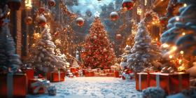 A Winter Wonderland: A picturesque town square comes alive with the magic of Christmas, adorned with twinkling lights, a majestic tree, and a blanket of fresh snow.