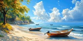 Serene Shores: Two wooden boats drift lazily in a tropical paradise, nestled between towering cliffs and a crystal-clear sea.