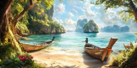 Serene Shores: Two wooden boats drift lazily in a tropical paradise, nestled between towering cliffs and a crystal-clear sea.