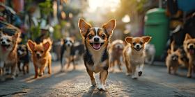Pack of Pups on Patrol: A Group of Small Dogs Run Joyfully Down the Street