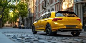 City Cruising: A Vibrant Car Navigates a Cobblestone Street