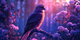 Silhouette of Solitude: A Hawk Perches on a Branch as the Sun Sets Over a Misty Forest