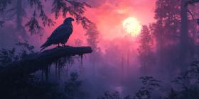 Silhouette of Solitude: A Hawk Perches on a Branch as the Sun Sets Over a Misty Forest