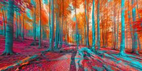 Autumnal Enchantment: A Path Winds Through a Forest of Crimson Birch Trees